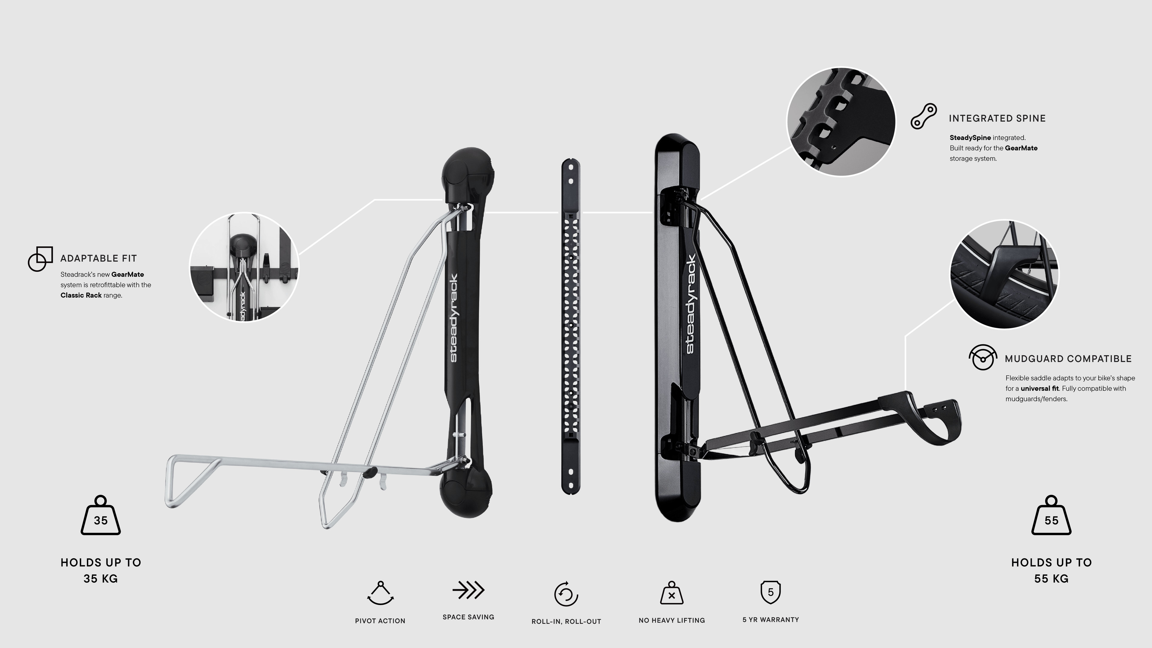 The ProFlex comes with user-friendly end caps that slide-and-click into place for effortless installation. The new SteadyRest is designed to accommodate the increasing width of fat tyres, ensuring a secure fit for a range of bikes as well as reduces scuffing on your wall and serves as a pivot point. The inclusion of the dovetail mounting plate makes it an adaptable system for future Steadyrack products. The ProFlex rack also includes the Gearmate SteadySpine, making it compatible with the GearMate system.